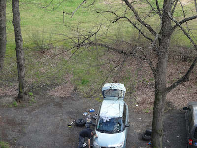 Our big helper got to "help" Papi while changing tires a few weekends ago. He had a blast. Andre said he got EVERYTHING out of the trunk. :)